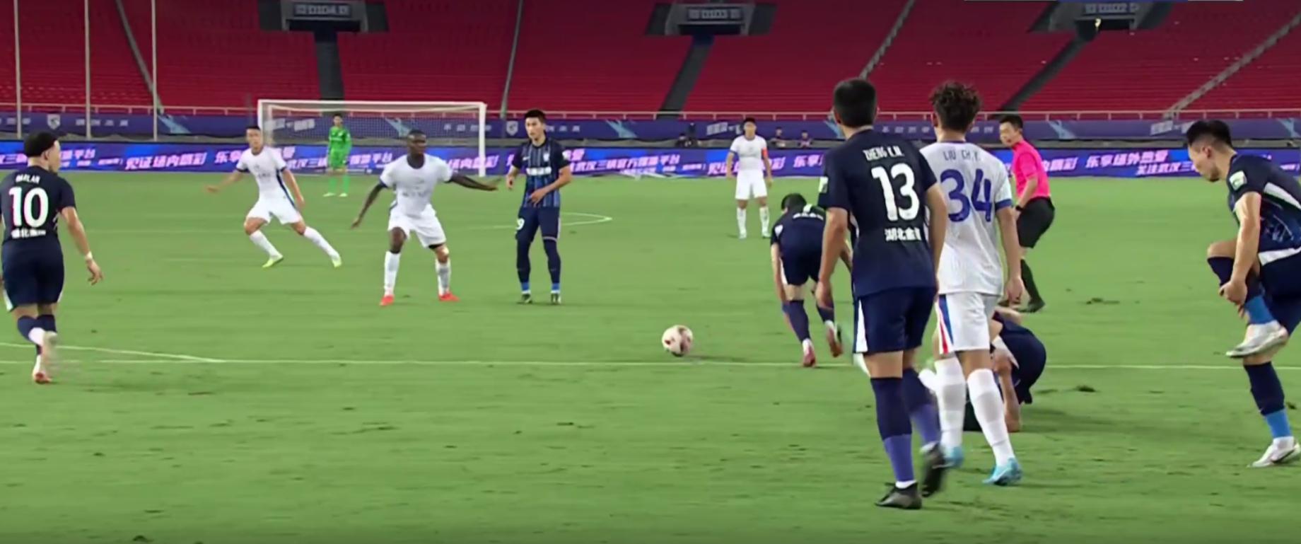 比赛开始后的第4分钟,上海申花就取得了进球,当时申花获得了一个前场任意球,禁区内的混战之中,阿苏埃用身体将球撞进球门,但慢镜头显示,他在用身体撞球之前,有一个明显的手球,所以被判无效。